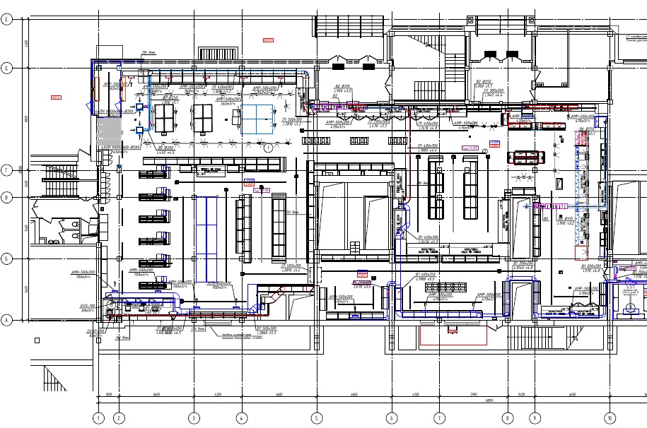 Продовольственные магазины и супермаркеты с секцией продовольственных товаров. Этот проект относится к категории сложных, особенно если магазин находится в жилом здании. Сложности возникают с организацией погрузочно-разгрузочного узла и полноценной системы вентиляции в жилом здании. Еще одна возможная проблема - недостаток выделенной электрической мощности. Необходимость согласовывать проект (обычно заказчика интересует разрешение на проведение строительных работ) также сопряжено с рядом дополнительных трудностей.  Наличие продовольственных товаров влечет за собой необходимость разработки технологического проекта с описанием особенностей хранения этой группы товаров и расстановкой холодильного торгового оборудования. Если в магазине предусматривается выпечка хлеба, гриль, кулинария, это также отражается в проекте технологии и под это оборудование затем будут выделены вентиляционные и электрические ресурсы. В соответствии с проектом технологии разрабатывается раздел ОВ (Отопление, вентиляция, кондиционирование) обеспечивающий воздухообмен и температурный режим в торговом зале, а также разделы ЭОМ (Система электроосвещения и силовое оборудование) и ВК (Водоснабжение и водоотведение). Следующая особенность: проектировщику наверняка придется работать над проектом в авральном режиме (дорогостоящая аренда и необходимость срочного открытия магазина к запланированной дате), а исходных данных либо не будет (арендодатель не предоставил), либо они будут недостаточными. В этом случае мы проводим экспресс-обследование помещений, конструкций, инженерных систем и полагаемся на свой опыт.